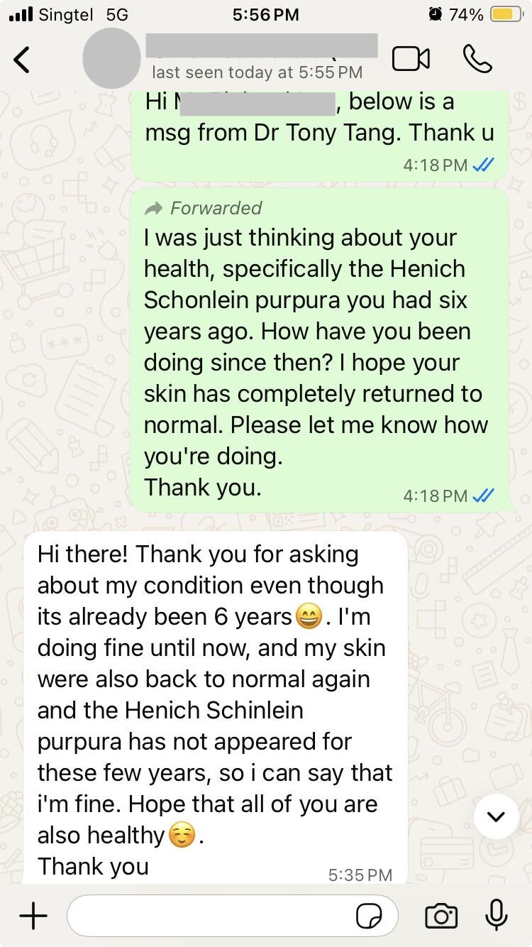 *At the December 2025 follow-up—conducted six years after the index evaluation—the patient’s Henoch–Schönlein purpura HSP remained in sustained remission. We sincerely appreciate the patient’s thoughtful feedback.*
