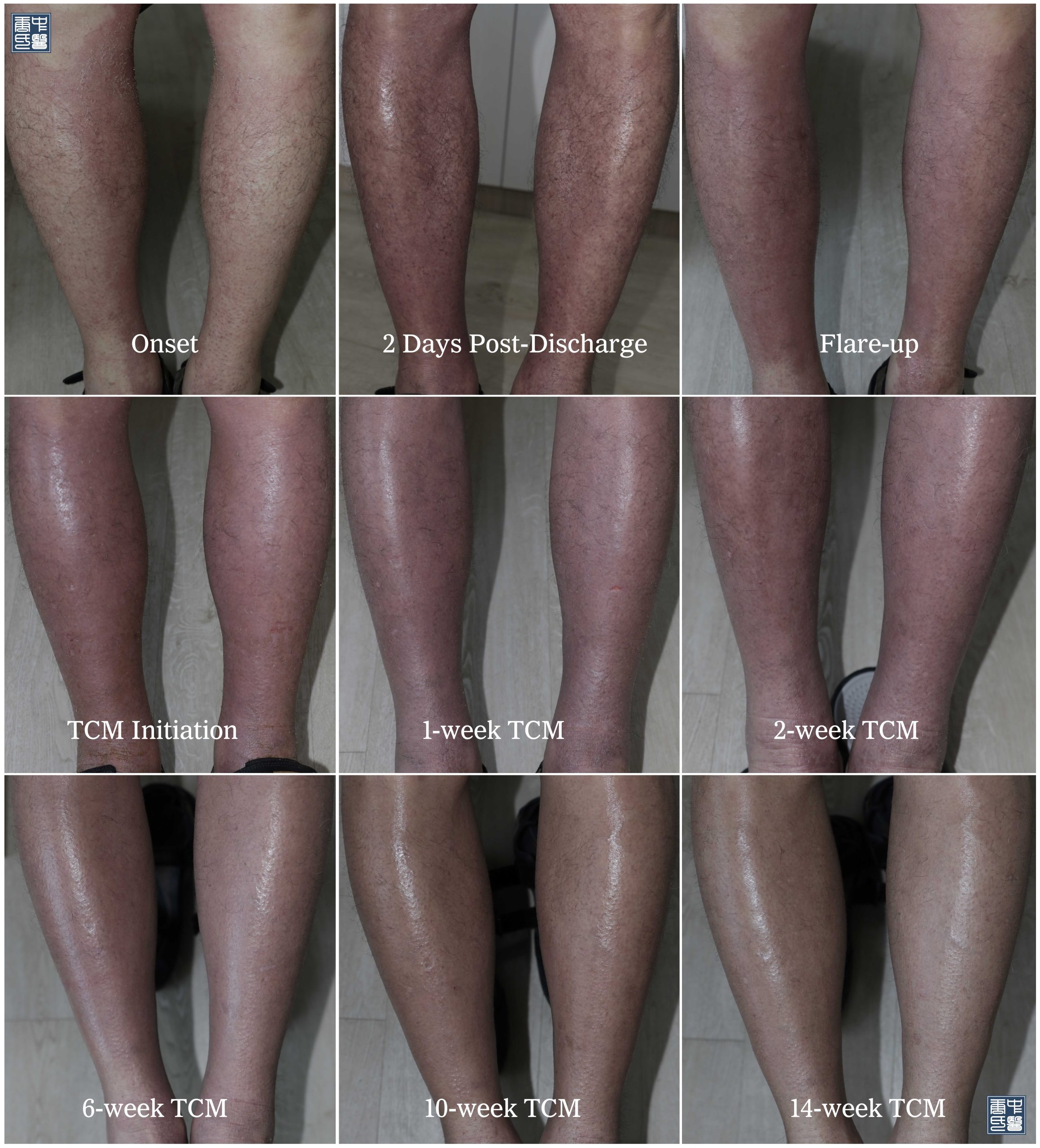 体检发现,40%体表面积出现红斑,疑似急性过敏反应。患者被转诊至医院急诊部进一步检查。两天后,在糖皮质激素泼尼松龙和抗生素头孢氨苄的治疗下,面部和身体的红疹明显减退,但下肢的红疹未有好转。患者开始使用外用皮质激素药膏。然而,出乎意料的是,五天后,涂抹皮质激素后,皮疹面积扩大,下肢红肿加重。血液检测和体检指标均在正常范围内。患者认为是皮质激素药膏过敏,停止使用激素药膏,但皮疹仍未消退,皮肤仍然发红、瘙痒,下肢肿胀加重。经过分析,认为是油漆接触引发了接触性皮炎或湿疹,并伴随皮质激素撤药后的反弹现象。患者开始接受中药治疗,包括口服和外用植物药膏。两周后,皮疹开始变薄,下肢红肿逐渐消退,瘙痒明显减轻。继续服药14周后,皮疹完全消退。您可以在我们的视频频道找到此案例的完整恢复影像。