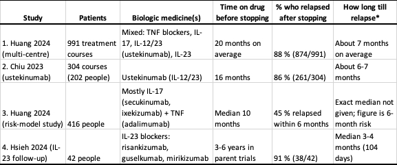 Across three of the four studies, roughly 8–9 out of 10 patients flared again after stopping their biologic. Even the IL-23 group, which many doctors think is longer-lasting, showed most relapses within a year. One study that mixed mainly IL-17 drugs saw a lower figure (about 1 in 2 relapsed by 6 months), but the authors only tracked that 6-month window, so the final total would likely be higher. Bottom line: biologics control psoriasis well while you take them, but stopping usually leads to a comeback fairly quickly.[1][4-6]