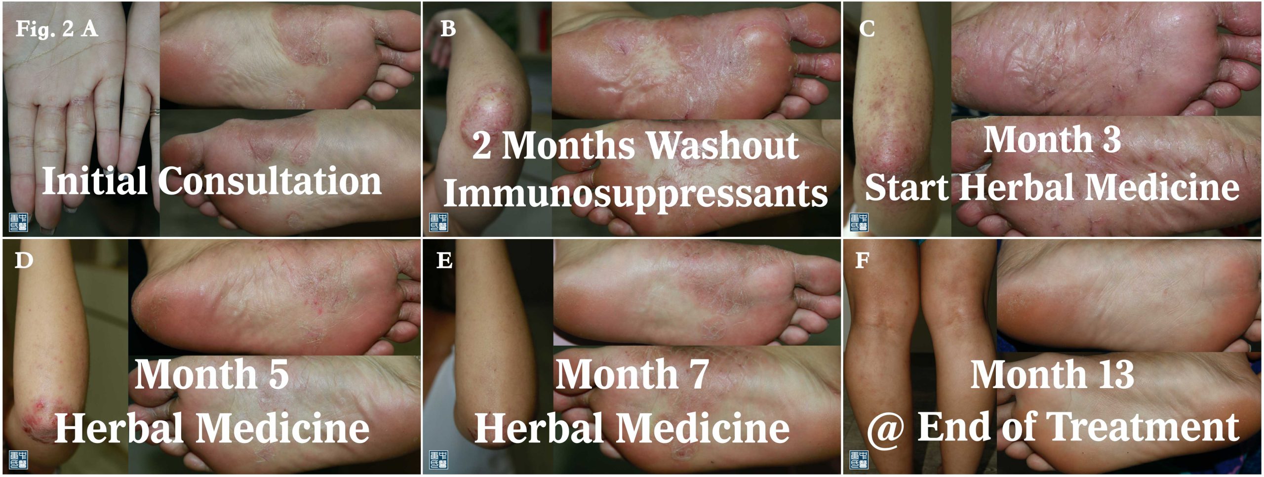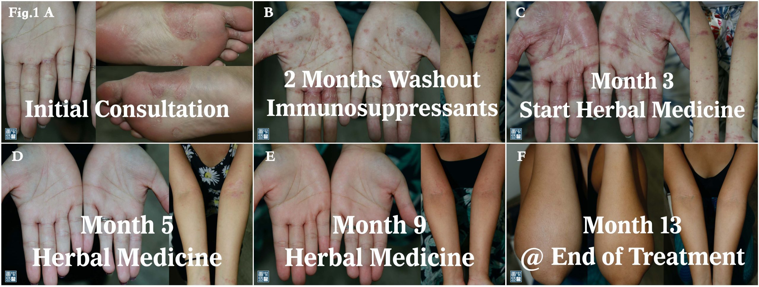 She was given 2 months of natural washout for her prior immunosuppressants, following with the herbal TCM medicine initiated. The eczema flares up intesively due to immunosuppressants withdrawal, 2 months later, she responded to the herbal treatment well, with the eczematous lesion subsiding and flaked off. Her eczema is in complete remission at the end of treatment month 13 on Fig.1F and Fig.2F [3]. There is no relapse on the follow-up till date.